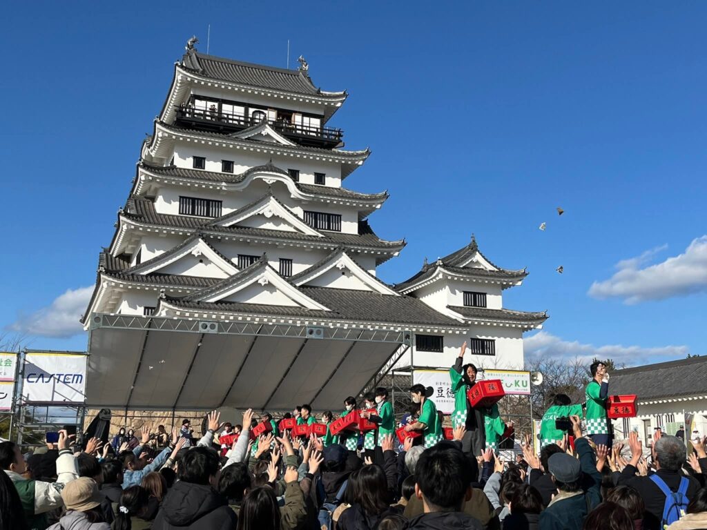 福まきは、福山城天守前広場にて、例年1月末から2月上旬の節分前に開催される、福山市の冬の風物詩ともいえる大規模イベントです。市民ボランティア団体「KOREFUKU」様が主催されており、当日は2万個以上の福豆や、商品引換券などが入った「福カプセル」がまかれ、毎年約8,000人もの来場者で賑わいます。